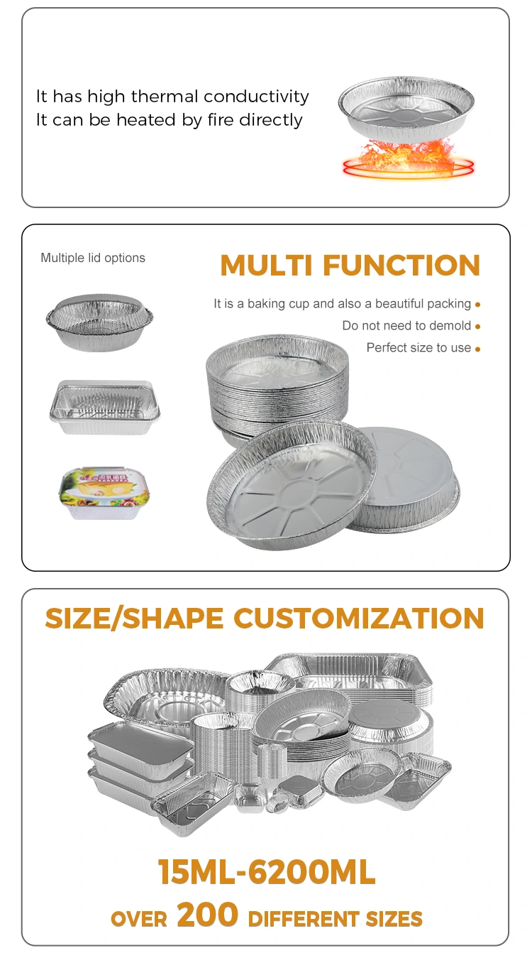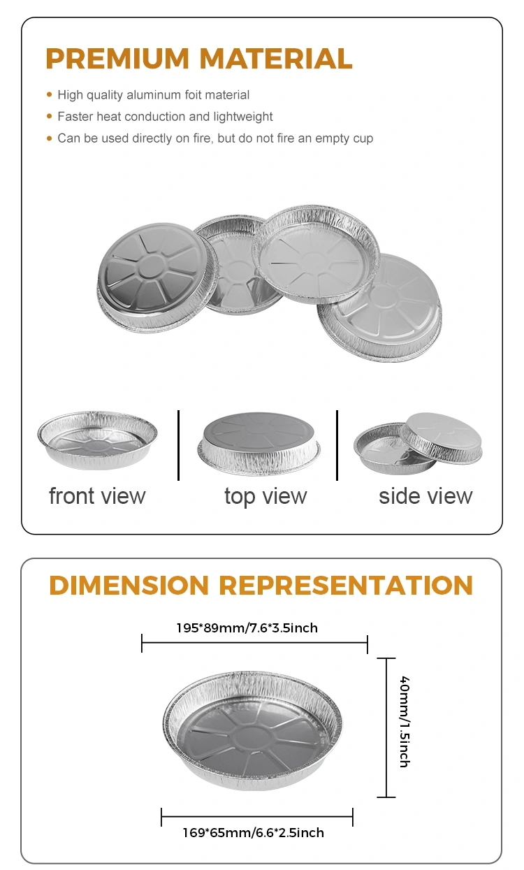 Hliníková fólia Yunchu ponúka hliníkové fóliové kontajnery s hliníkovým fóliou s pokrmou 7 palcov s modelom číslo 5067. Produkt má horný priemer 168 mm (približne 6,6 palca), dolný priemer 145 mm (približne 5,7 palca) a výšku 25 mm (približne 0,9 palca). S kapacitou približne 400 ml (približne 14,1 oz) je ideálna na pečenie pizze bez prilepenia počas pečenia, ľahko uvoľňovateľnej formy a bez zápachu. Okrem toho, jeho plne krimovaný dizajn zabraňuje rozliatiu potravín, čo zvyšuje praktickosť. Môžeme tiež poskytovať služby prispôsobenia loga, ktoré vám pomôžu prehĺbiť dojem vašich zákazníkov a vylepšiť viditeľnosť vašej značky.