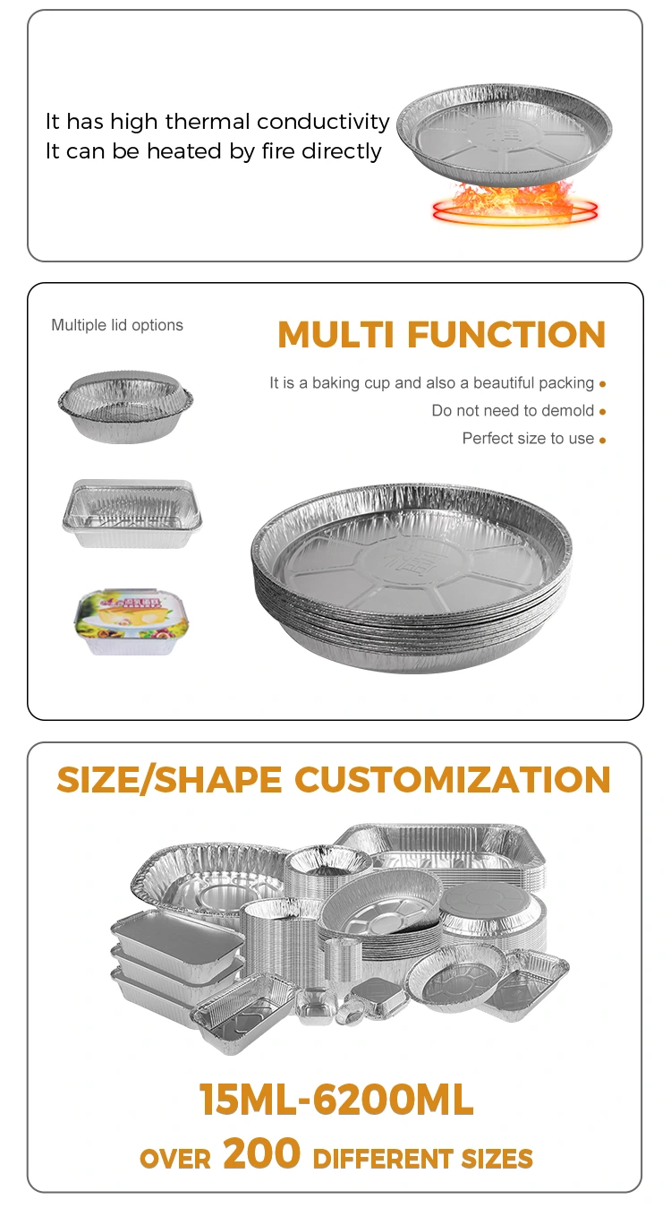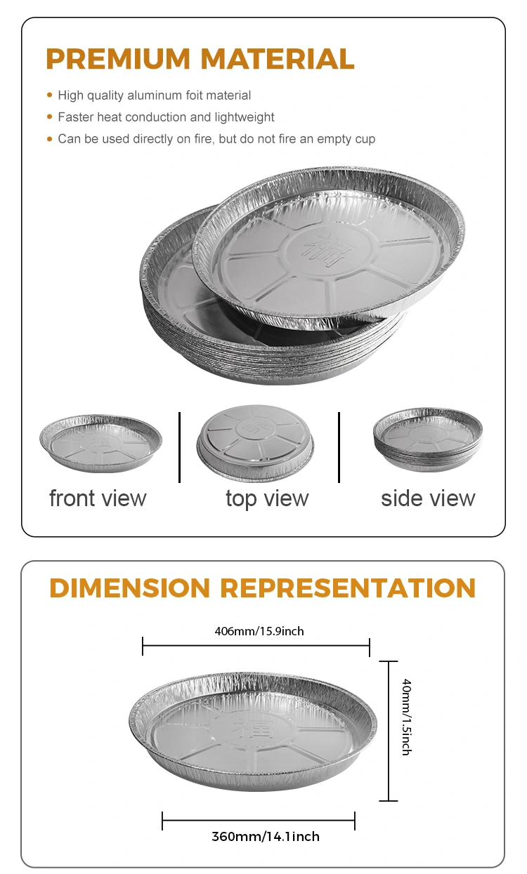 Hliníková fólia YUNUCHU Model dodávateľa YR3700 na jednorazové vzduchové fritézy Strieborná hliníková fóliová nádoba. Nádoba má v hornej časti priemer 406 mm (asi 15,9 palca), 360 mm (asi 14,1 palca) v spodnej časti, výška iba 40 mm (asi 1,5 palca) a kapacita asi 3 700 ml (asi 130,5 oz). Otvorené plameňové naparovanie je pohodlné a hygienické, pečenie v peci, vysoký teplo teplota 400 ° C nie je spálené alebo rozbité, pečenie v peci nie je lepkavé, nebojí sa mastného a úmyselného grilu kvôli jeho schopnosti priamo kontaktovať otvorené plamene, používatelia sa nemusia starať o bezpečnostné problémy. Hliníkové fóliové nádoby sú odolné voči vysokým teplotám, vysoko odolné voči pečeniu a nie je ľahké spáliť alebo zlomiť. Okraj celého kotúča je bez oleja, bráni prilepeniu potravy k stene hrnca a ochrana je intímnejšia.