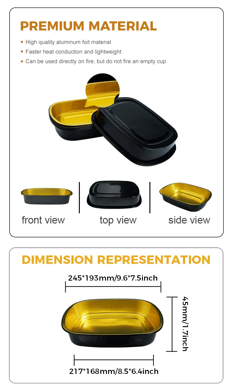 Hliníková hliníková fólia Dodávateľa Fóliu na jedno použitie Čierne zlaté pečenie Zásobník obdĺžnikovej hliníkovej fólie MF1450 je vhodný pre rozsiahle stravovanie, zvlášť vhodné pre stravovanie jedál, sklady reťazca reštaurácií a chladiareň v chlade o výšku potravín a ďalšie scenáre a iné scenáre a iné scenáre, ktoré sú vyrobené z veľkých a iných scenárov. Silná tepelná vodivosť môže rovnomerne rozptýliť vysokú teplotu, aby sa zabezpečilo, že jedlo sa rovnomerne zahrieva, s dobrou kapacitou nosenia a kompresívnym výkonom, aby sa zabezpečilo, že nie je ľahké extrudovať a deformovať počas prepravy, sa môže používať s fóliovým tepelným tesnením alebo plastovým vekom.