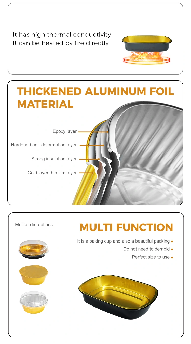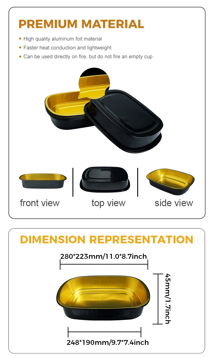 Yunchu hliníková fólia Dodávateľa na jedno použitie obdĺžnikových hliníkových hliníkových fólií s hliníkom na jednorázové zlato je vhodné Zložky na umiestnenie sa môžu použiť s vekom tesniaceho veka hliníkovej fólie a PET plne priehľadného veka, s vynikajúcim tesniacim výkonom, vysokým teplotným odporom a funkciou prevencie oleja a prevencie úniku. Všeobecne sa používa v rôznych scenároch, ako sú obaly potravín, vykurovanie, chladenie a dodávka so sebou. Povrch prijíma dizajn ľahkej steny s plochým a hladkým vzhľadom, ktorý je vhodný pre automatické utesnenie tepelne utesneného filmu, čím sa zlepšuje účinnosť obalu.