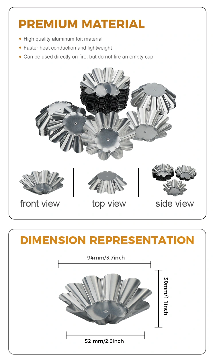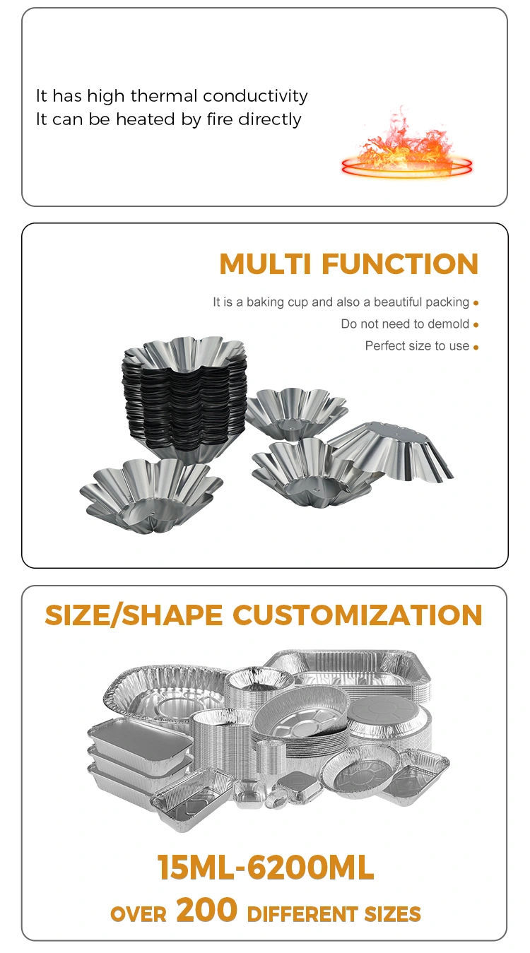Vonkajšie a pohodlné scény: Ľahké a prenosné, vhodné pre vonkajšie kempovanie, pikniky, večierky a iné scény. Vaječné koláče a občerstvenie je možné pripraviť vopred a vložiť do nádob bez toho, aby ste museli nosiť ťažké plechy na pečenie. Môžu byť zlikvidované priamo po jedle. Ľahko sa čistí a nezaberá miesto. Dá sa použiť aj na vyťahovacie balenie. Vlastnosti utesnenia a tepelnej ochrany materiálu hliníkovej fólie môžu účinne udržiavať teplotu a chuť dezertov a zabrániť úniku a deformácii počas prepravy.