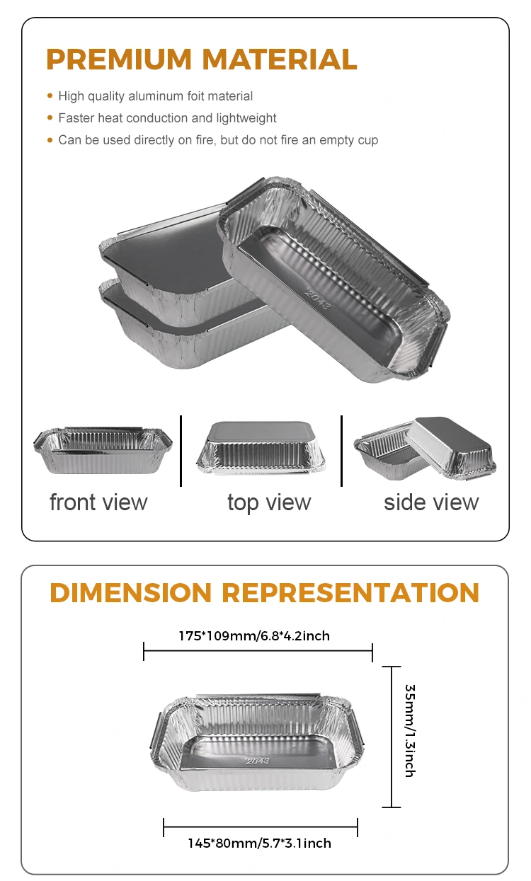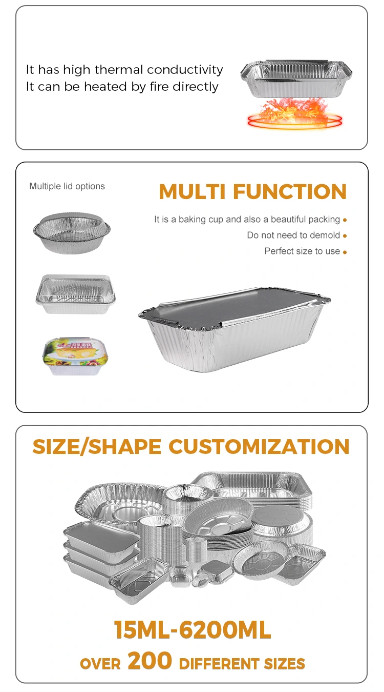 Táto jednorazová krabica na rýchle občerstvenie grilovanie strieborných hliníkových kontajnerov hliníkovej fólie je vyrobená z vysoko kvalitného materiálu hliníkovej fólie 8011, ktorý má dobrý efekt na konzerváciu tepla a dokáže udržať teplotu jedla, vďaka čomu je jedlo chutnejšie a chutnejšie. Okrem toho je náš obdĺžnikový kontajner hliníkovej fólie strieborného BBQ vybavený tepelnou izolačnou funkciou, ktorá je možné spárovať s vekom hliníkovej fólie alebo plastovým plastickým vekom, ktoré je vhodné pre prispôsobené logo a ďalej vylepšuje obraz značky.