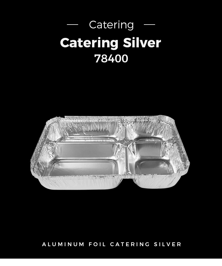 Yunchu Aluminum Foil Supply Factory launched a new Disposable multi-compartment fast food Silver Aluminum Foil Containers, model number 78400. The container is cleverly designed, with an upper diameter of 244 mm (9.6 in) and 195 mm (7.6 in) and a lower diameter of 217 mm (8.5 in) and 168 mm (6.6 in), with an overall height of only 41 mm (1,6 palca). S kapacitou približne 1020 ml (36,0 oz) je pohodlná a praktická pre držanie rôznych potravín v štyroch priehradkách.