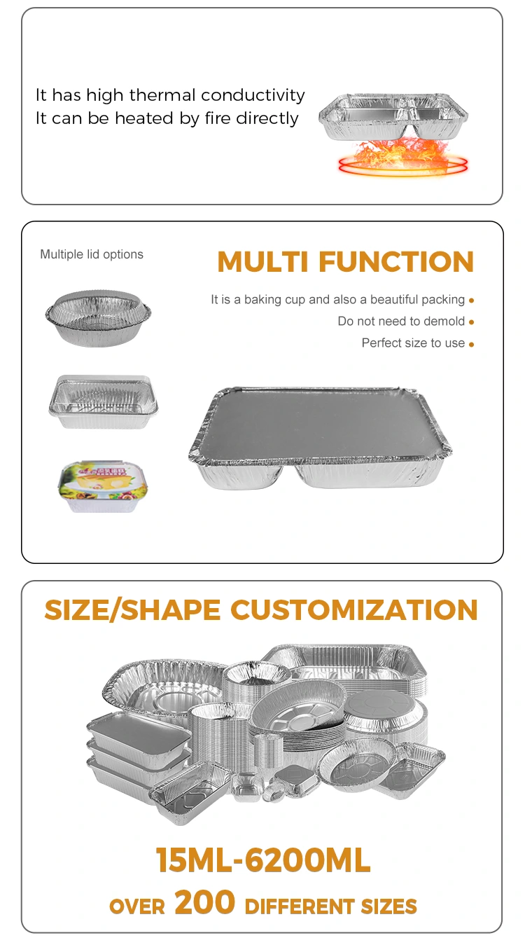 Jednorazové viaceré kompartmenty Strieborné hliníkové fólie s rýchlym občerstvením s veciami papiera fungujú dobre na jeseň a zimu kvôli ich dobrým vlastnostiam pri zadržiavaní tepla. Či už ide o čerstvo vyrobený horúci guláš alebo iné horúce jedlo, môže si udržať vhodnú teplotu po dlhú dobu, čo umožňuje spotrebiteľom vychutnať si horúcu jedlo.