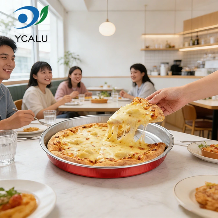 Dodávateľ hliníkovej fólie Yunchu C900 na jednorazové balenie pizzovej panvice Okrúhly kontajner z hliníkovej fólie je vyrobený z potravinárskej surovej hliníkovej fólie bez zápachu a nečistôt, vďaka čomu je bezpečné dotýkať sa potravín s dôverou. Hrúbka je rovnomerná a pevná a odolá vysokým teplotám do 250°C a nízkym teplotám do -20°C. Čerstvo horúcu pizzu môžete podávať priamo. Dá sa chladiť a udržiavať čerstvé bez výmeny nádoby. Môže sa jesť priamo ohrievaním, čo výrazne zlepšuje efektivitu donášky jedla a šetrí námahu pri čistení. Hliníkový PET kryt účinne blokuje prenikanie vodných pár a vzduchu a zabraňuje úniku mastnoty. Klasický okrúhly oblúk presne pasuje na všetky typy tvarov pizze s viacerými dostupnými veľkosťami od 7 do 9 palcov. Je dokonale vhodný pre rôzne špecifikácie, ako je ručná pizza, talianska pizza a americká hrubá kôra. Neexistuje žiadny ďalší priestor, ktorý by zabránil šmýkaniu pizze a odpadávaniu polevy. Proces formovania z jedného kusu vytvára stabilný tvar, je odolný voči tlaku a kolíziám a pri preprave sa ľahko nedeformuje alebo nepoškodí. Dokáže si zachovať svoj tvar aj pri skladaní a skladovaní, čím sa úplne vyrieši problém s ľahko poškodeným obalom a zabezpečí sa, že každá pizza bude doručená v dobrom stave.