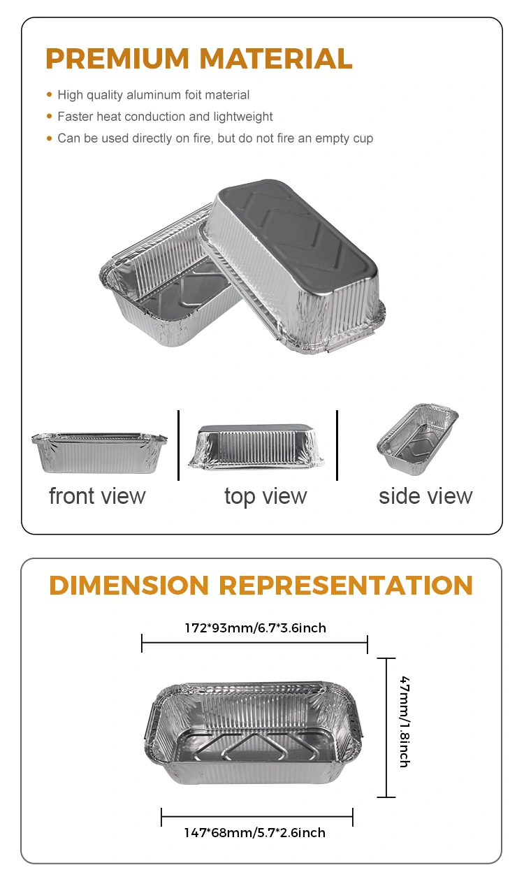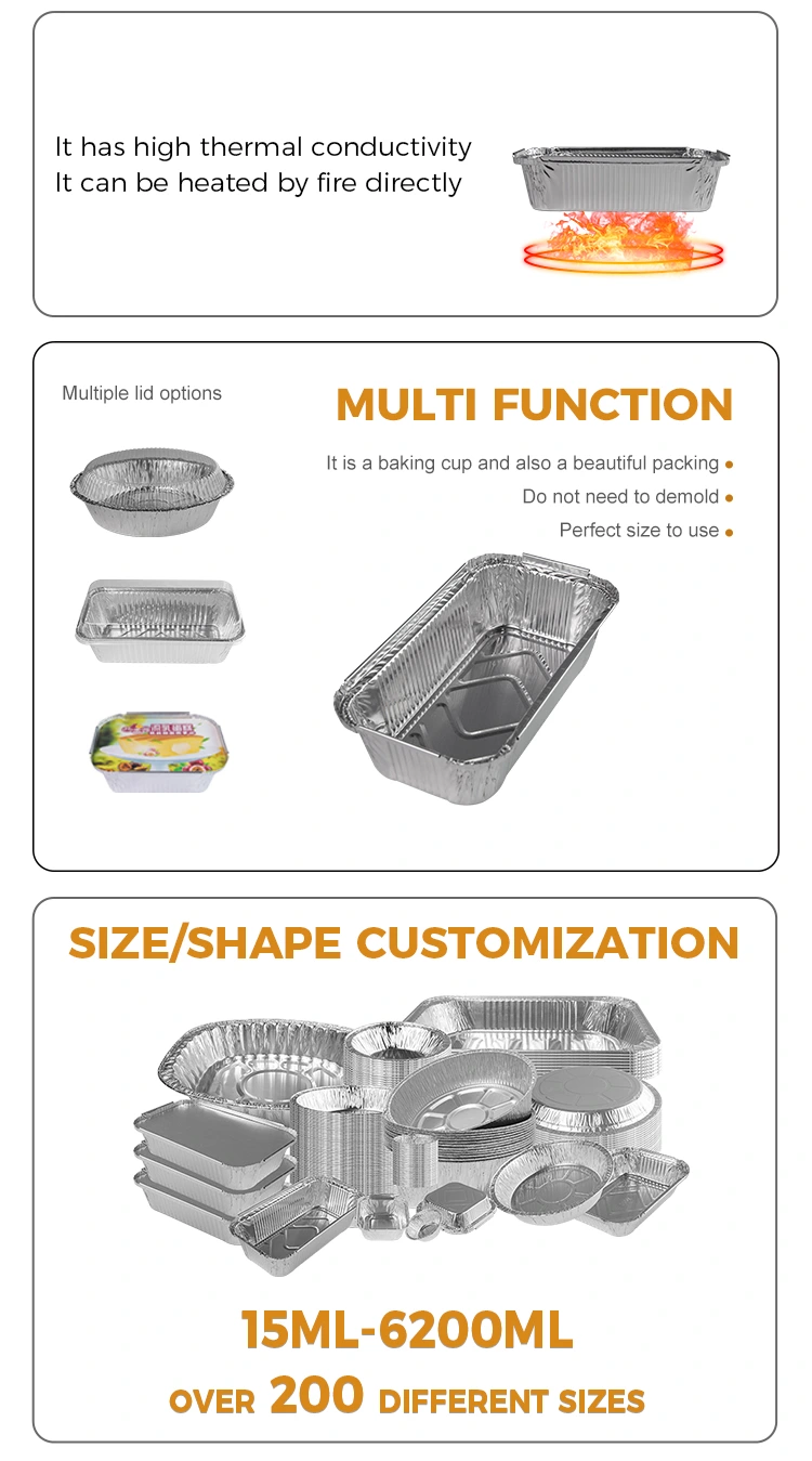 Jednorazové obdĺžnikové kontajnery hliníkovej fólie z hliníka z hliníka z hliníkovej fólie Yunchu je všestranný kuchynský náradie vhodný pre rôzne metódy varenia, ako sú grilovanie, horúca hrniec, gratin, balenie so sebou a ďalšie. Táto kontajner je dostatočne kompaktná, aby vyhovovala rôznym hrncom a vybaveniam a je dodávaná v rôznych veľkostiach, aby vyhovovala potrebám rôznych otvorených plameňových grilov. Môže sa použiť na výrobu rôznych potravinárskych výrobkov, ako sú ovzdušie a ďalšie aplikácie zariadení, odolnosť proti tepla a oleja, ľahké pečenie.