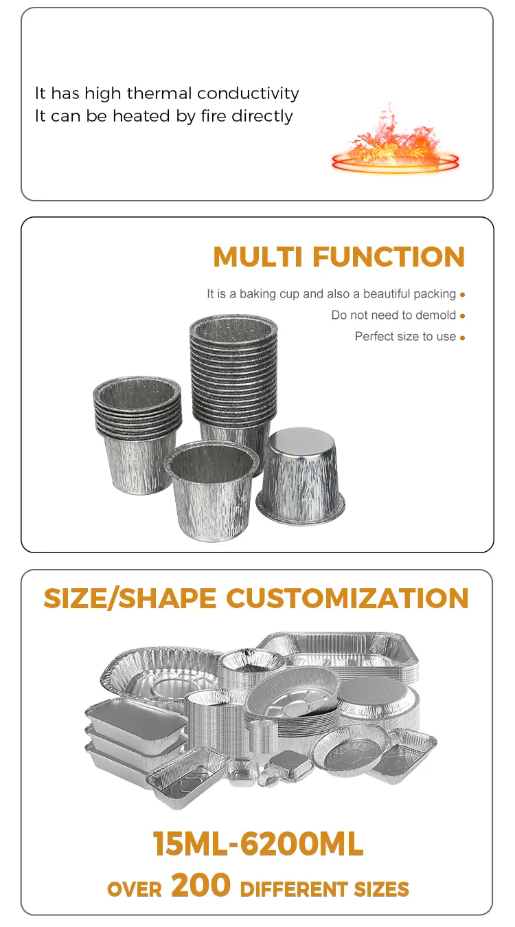 Hliníková fólia Yunchu Jednorazový okrúhly koláčový pohár výrobcu striebornej hliníkovej fólie je vyrobený z potravinárskej hliníkovej fólie s vysokou čistotou. Prešiel prísnym testovaním kvality a je bez zápachu a bez škodlivých prísad. Priamy kontakt s prísadami poskytuje väčší pokoj, chráni každé sústo sladkosti a zdravie. Proces zahustenej hliníkovej fólie vytvára pevné telo pohára, ktoré nie je ľahké zdeformovať alebo zlomiť. Dá sa použiť na rôzne tortové cestá, peny, pudingy a iné ingrediencie. Odoláva vysokým teplotám až do 250°C a nízkej teplote až -20°C pre rúry, chladničky, fritézy a iné spotrebiče. Dá sa dobre prispôsobiť pečeniu, chladeniu a mrazeniu. Nie je potrebné vymieňať alobal a nie je tu príliš veľa zdĺhavých krokov. Klasický okrúhly dizajn, telo pohára je okrúhle a hladké a zodpovedajúci strieborný kovový lesk nevyžaduje žiadne ďalšie dekorácie. Môže sa podávať priamo po upečení a bude mať efekt prezentácie na úrovni cukrárne. Ústie pohára je jemne stočené, vďaka čomu je hladké na dotyk a neškriabe ruky. Zabraňuje vytekaniu cesta pri nalievaní a uľahčuje vyberanie z formy.