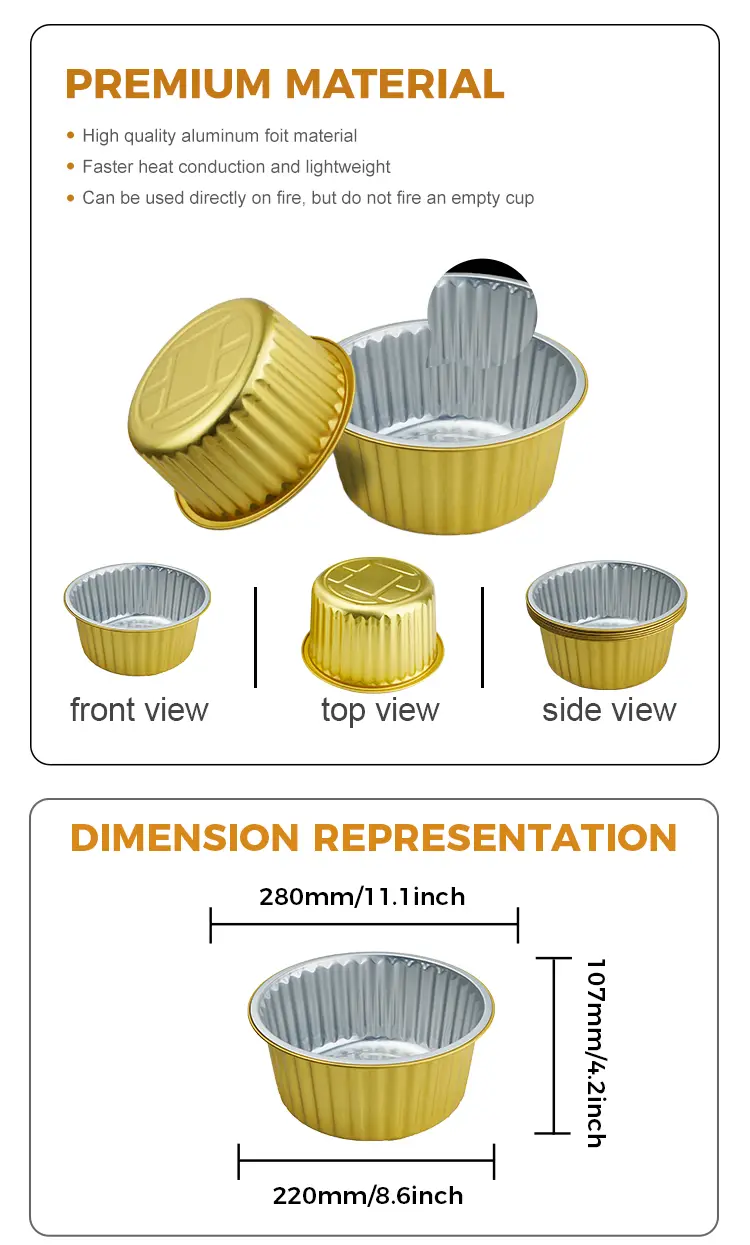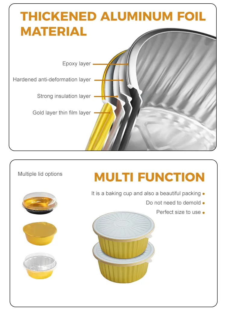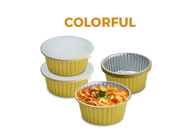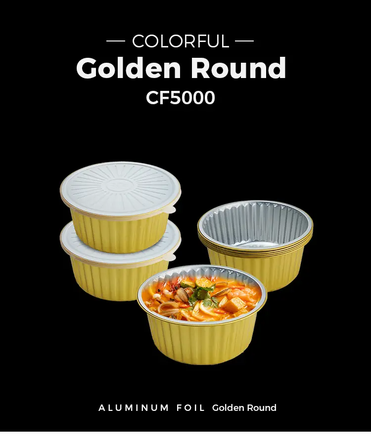 • Jednorazové zapečatené zlaté okrúhle hliníkové kontajneryJednorazové zapečatené zlaté okrúhle hliníkové kontajnery