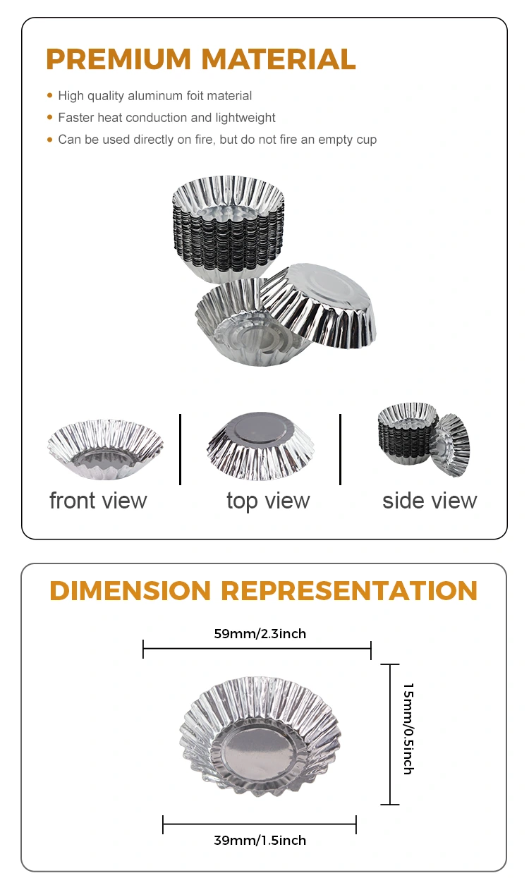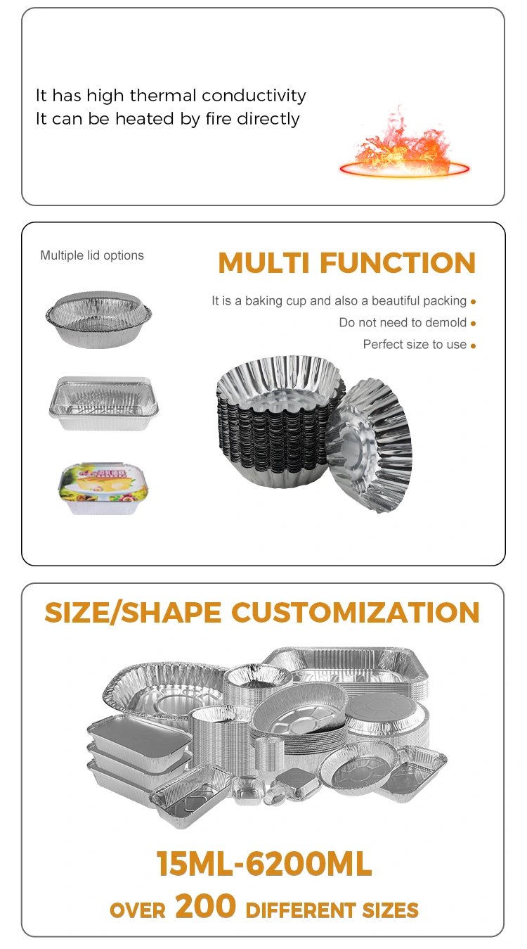 Yunchu hliníková fólia vaječný koláč na pečenie strieborná hliníková fóliová nádoba Výrobok Veľkoobchod určený pre vaječné koláče a ďalšie dezerty. Je vyrobený z hliníkovej fólie na potraviny, ktorá je bezpečná a netoxická a má dobrú tepelnú vodivosť, čím sa zabezpečuje rovnomerné vyhrievanie potravín a má lepšiu chuť počas procesu pečenia. Tento podnos na vaječný koláč je všestranný a vhodný pre rôzne príležitosti, ako sú rodinné stretnutia, obchodné udalosti atď. Ľahko odstránenú pleseň pri vysokej teplote, keď je hotový výrobok, po dokončení hotového produktu, ľahko odstránený film, nelepiteľné dno, nepoškodzujte tvar, nepoškodzujte a stvrdnite a stvrdnite materiál, ktorý nie je ľahké, bezprostredne sa deformuje, bezplatne a prilepiť sa na spodok, nelepivé jedlo sa ľahko varí, spodná časť je hladká, vydrží -20 ° C ~ 300 ° C, môže sa zahriať cez otvorený plameň a forma sa rovnomerne zahrieva.