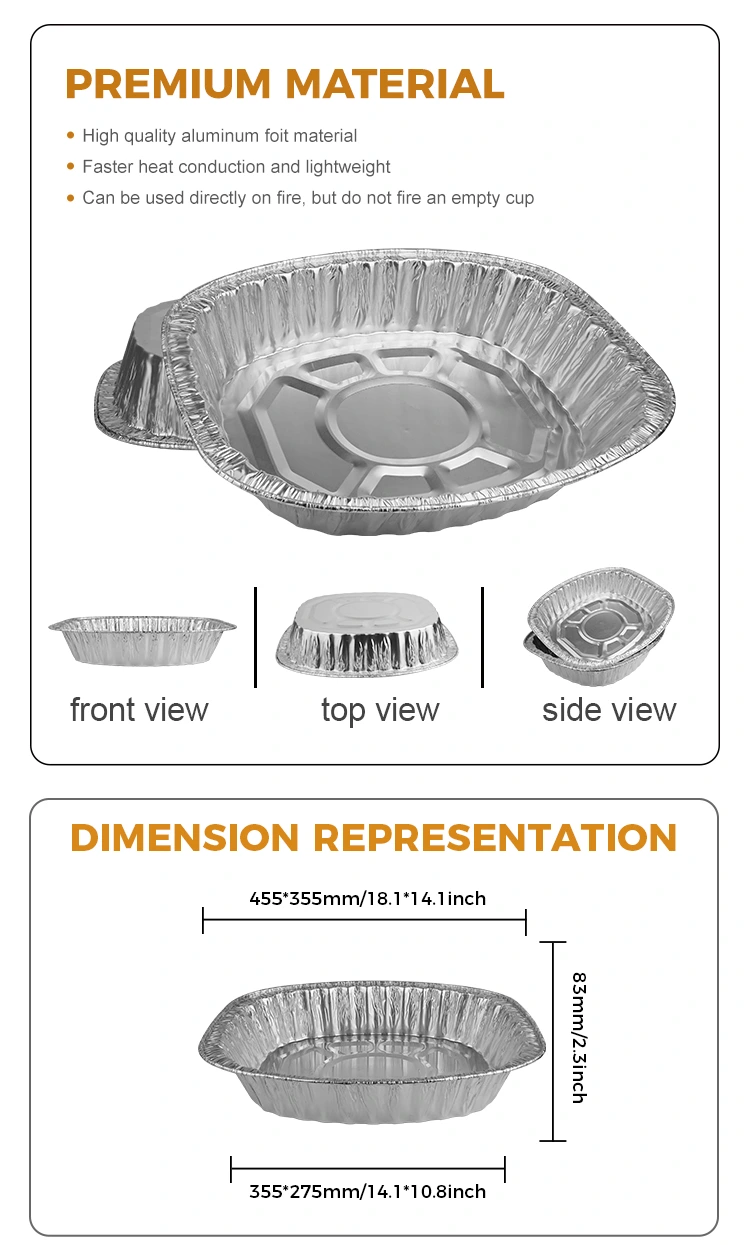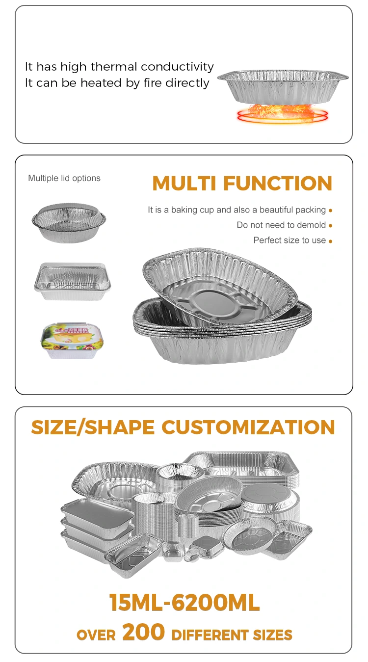 Tento produkt je jednorazovým produktom a nemusí sa čistiť, čo šetrí náklady na pracovnú silu. Môže sa spárovať s plne priehľadným vekom hliníkovej fólie, ktoré účinne zabraňuje úniku prachu a tekutiny. Trvanlivosť a bezpečnosť produktu sú vylepšené dizajnom výstuže a pravidelným konkávnym a konvexným tvarom dna. Prenosný dizajn uľahčuje prenos a teplo, odolné voči vysokým a nízkym teplotám, ktoré sa dajú použiť v teplotnom rozsahu -20 ° C až 250 ° C a je nepriepustný pre ropu a vodu, čím sa zvyšuje retencia tepla a prepravná tesnosť produktu.