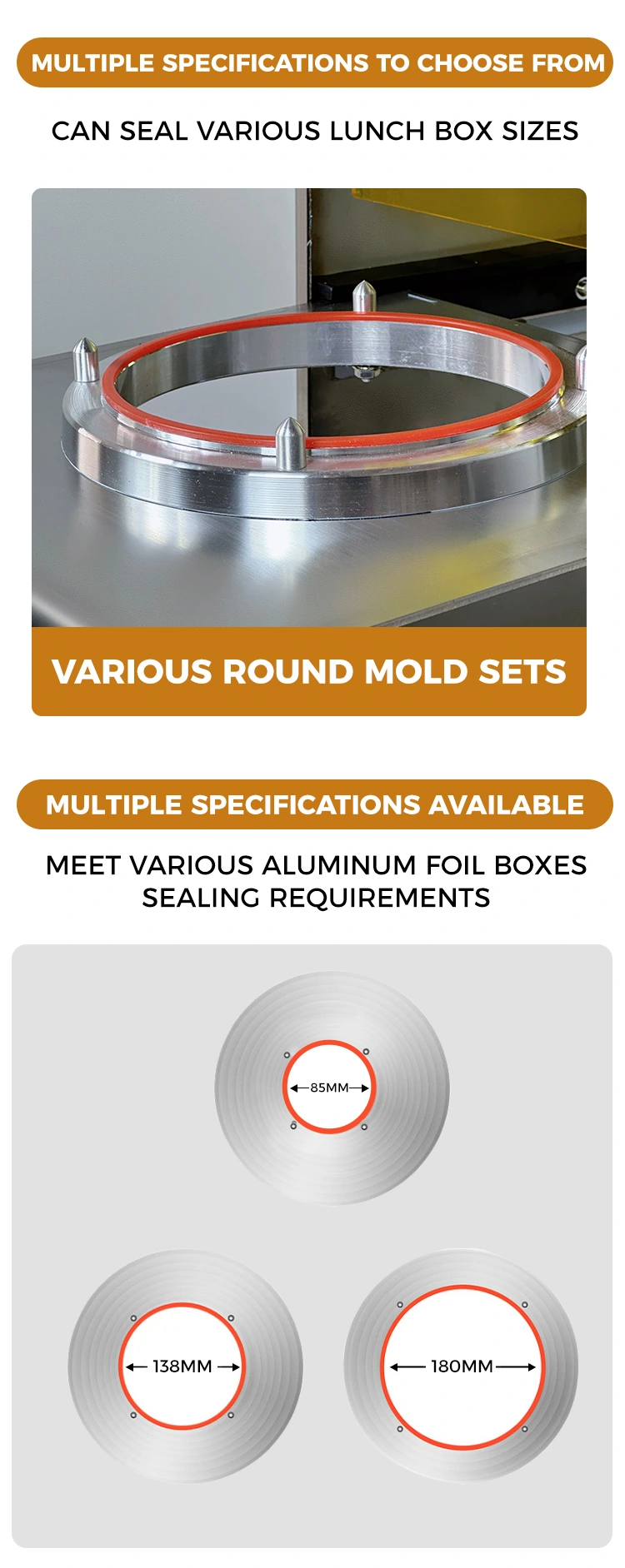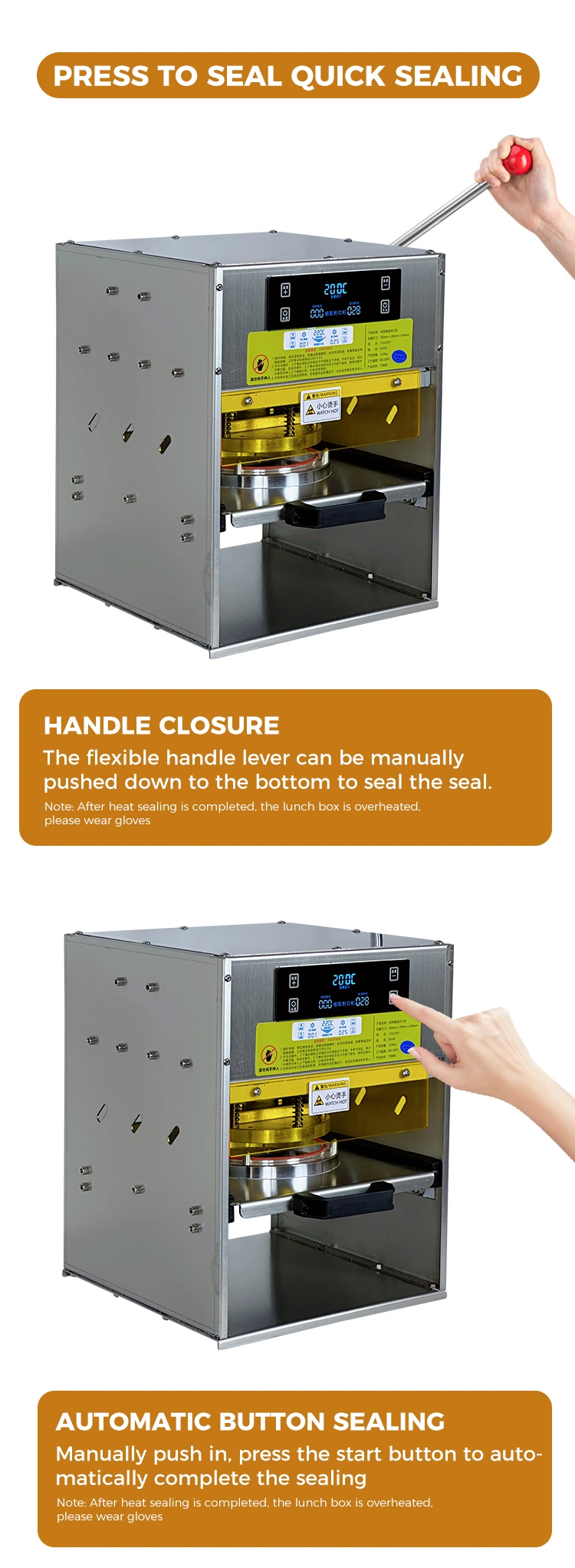 Silná prispôsobivosť a jednoduchá obsluha: Dokonale kompatibilné s týmto zlatým obedárom a tiež kompatibilné s rôznymi obalmi z kompozitnej fólie PP/PE. Nevyžaduje sa žiadne odborné školenie a môžete začať už za 10 sekúnd. Jednoducho zatvorte a zarovnajte krabičku na obed a jemne stlačte tepelný uzáver na 3 až 5 sekúnd, aby sa dokončilo tesnenie, čím sa výrazne zlepší účinnosť balenia.