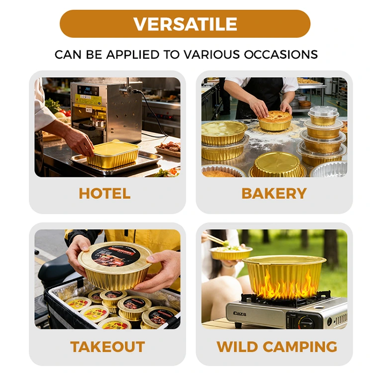 Komplexnejšie scenáre: Odvetvie stravovania: špičková dodávka so sebou, porciovanie banketov, balenie vopred pripravených potravín, kombinácia kvality a praktickosti; Potravinárske podnikanie: Malé dielne na občerstvenie, spracovanie omáčok, elektronický obchod s čerstvými potravinami, dosiahnutie profesionálneho balenia pri nízkych nákladoch; Festivalové darčeky: Vianoce, jarný festival, festival polovice jesene a iné festivalové darčekové krabičky na jedlo. Zlatý vzhľad umocňuje slávnostnú atmosféru a zapečatený dizajn zaisťuje čerstvosť darčekov.