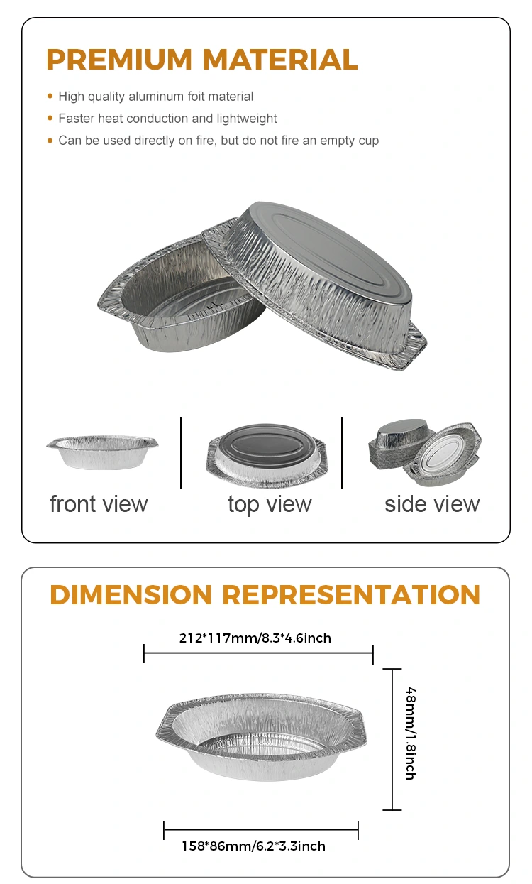 Hliníková fólia Yunchu Hliník Oval Pečené nádoby na hliníkové fólie Strieborné fólie sa môžu používať priamo v rúre alebo grile, čo je veľmi pohodlné. Váži iba 5,9 gramov, je ľahké sa elegantne naskladať a efektívne šetriť priestor na prepravu, pokovovanie reštaurácií a kuchyňu. Proces svetelnej steny produktu robí povrch hladký a uprataný a strieborný jasný vzhľad je nielen krásny a elegantný, ale tiež pohodlný pre veľké supermarkety na označenie a skenovanie kódov.