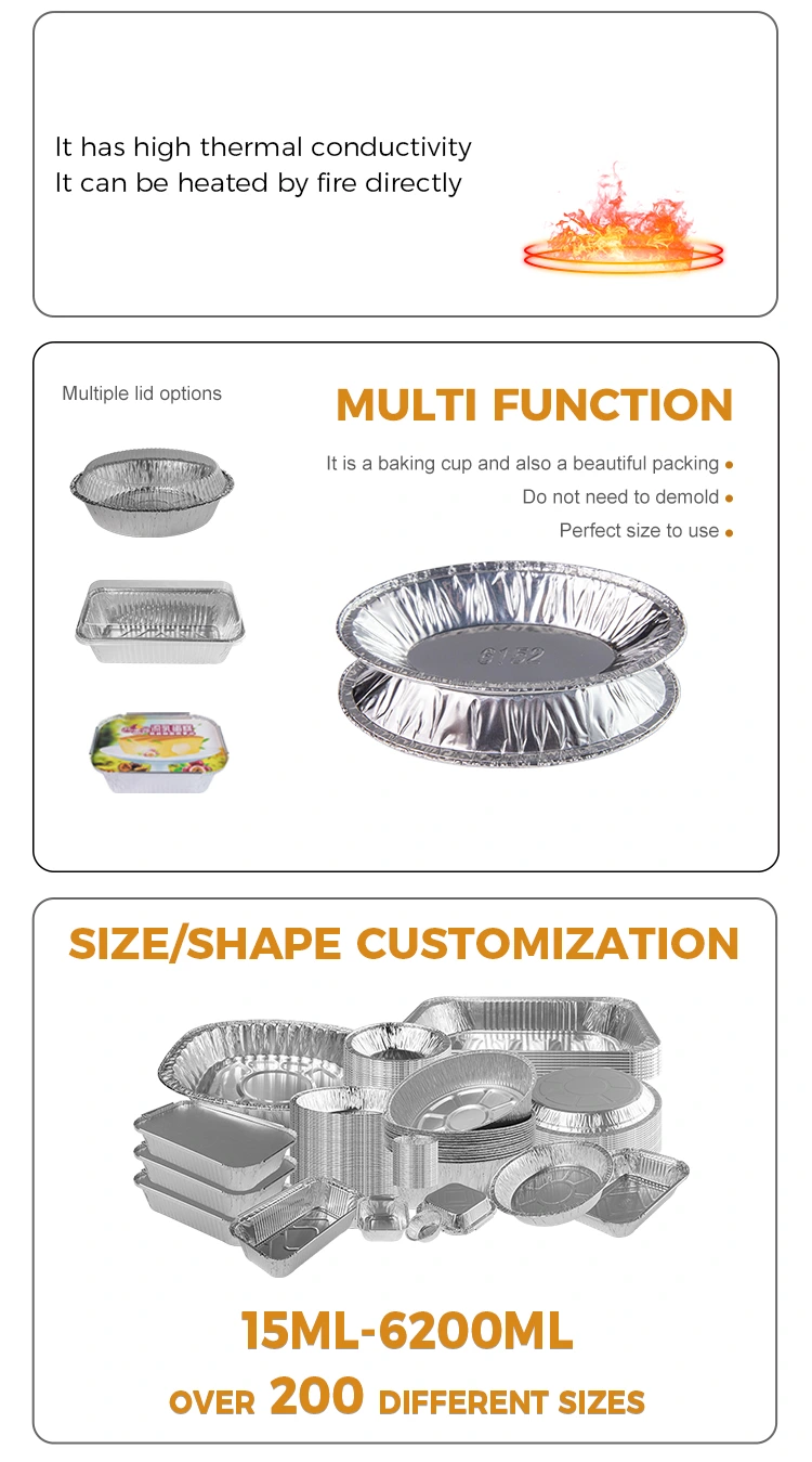 Hliníkové hliníkové hliníkové fóliové kontajnery Yunchu Hliníková fólia sú na trhu jedinečné s vynikajúcimi vlastnosťami výrobkov. Táto nádoba vedie rovnomerne teplo a neopaľuje ľahko, zabezpečuje rovnomerné vyhrievanie potravín a varí chutné a bezpečné jedlo. Vlastnosti odolné voči olejom a odolné voči farbám uľahčujú demolding, s pokrytým tvarom okolo neho pre ľahký prístup a zaoblené a hladké dno, ktoré je možné rýchlo odstrániť iba ľahkým tlačidlom. Po použití ho vyhoďte, nie je potrebné čistiť, čo je bezstarostné a hygienické. Táto kontajner má veľkú kapacitu a dokáže držať viac ingrediencií naraz, vďaka čomu je vhodný pre rôzne potreby pečenia. Či už ide o koláče, koláče, alebo výrobu vaječných žĺtkových lupienkov, misky, grily a iné pochúťky, je to všestranná voľba.