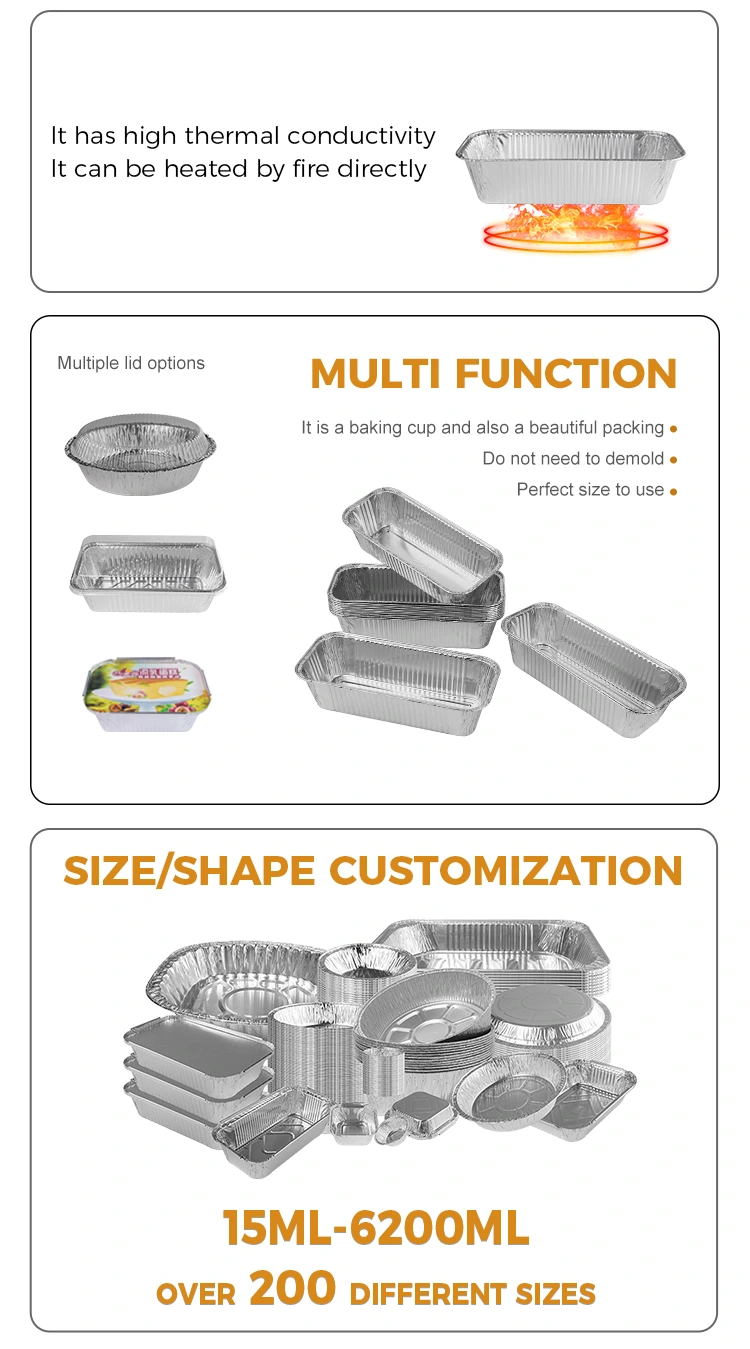Hliníková hliníková fólia Yunchu Model 2325 Obdĺžnikový vzduchový fritéza Strieborné hliníkové fóliové nádoby Vysokok kvalitnej hliníkovej fóliovej fólii sú zhrubnuté a nie je ľahké sa rozbiť a môže sa zahriať na otvorenom plameňoch, tento nádoba z hliníkovej fólie je nielen krásna, ale tiež veľmi praktická. Dokáže vydržať vysoké teplotné pečenie, nie je ľahké spáliť alebo deformovať dno a dizajn dna je tiež krásny a elegantný, čo môže účinne zabrániť prilepeniu potravín. Okrem toho vďaka svojej vysokej obrannej dizajne je kombinácia hliníkovej fólie stabilnejšia a ľahšie použiteľná. Bez ohľadu na to, ktorá špecifikácia veľkosti si vyberiete, tento kontajner hliníkovej fólie sa dokonale prispôsobí rôznym veľkostiam kvetináča a uspokojuje vaše rôzne potreby. Aby sme umožnili viac spotrebiteľom vychutnať si vysoko kvalitné výrobky a služby, poskytujeme z nich rôzne špecifikácie veľkosti a môžeme prispôsobiť tlač vzorov podľa vašich potrieb tak, aby vyhovovali prispôsobeným potrebám. S jediným MOQ s iba 1 000 kusmi je proces nákupu jednoduchý a rýchly a výkon nákladov je mimoriadne vysoký. Ak máte akékoľvek otázky alebo potrebujete ďalšie porozumenie o našich produktoch, neváhajte nás kontaktovať, radi vám budeme slúžiť.