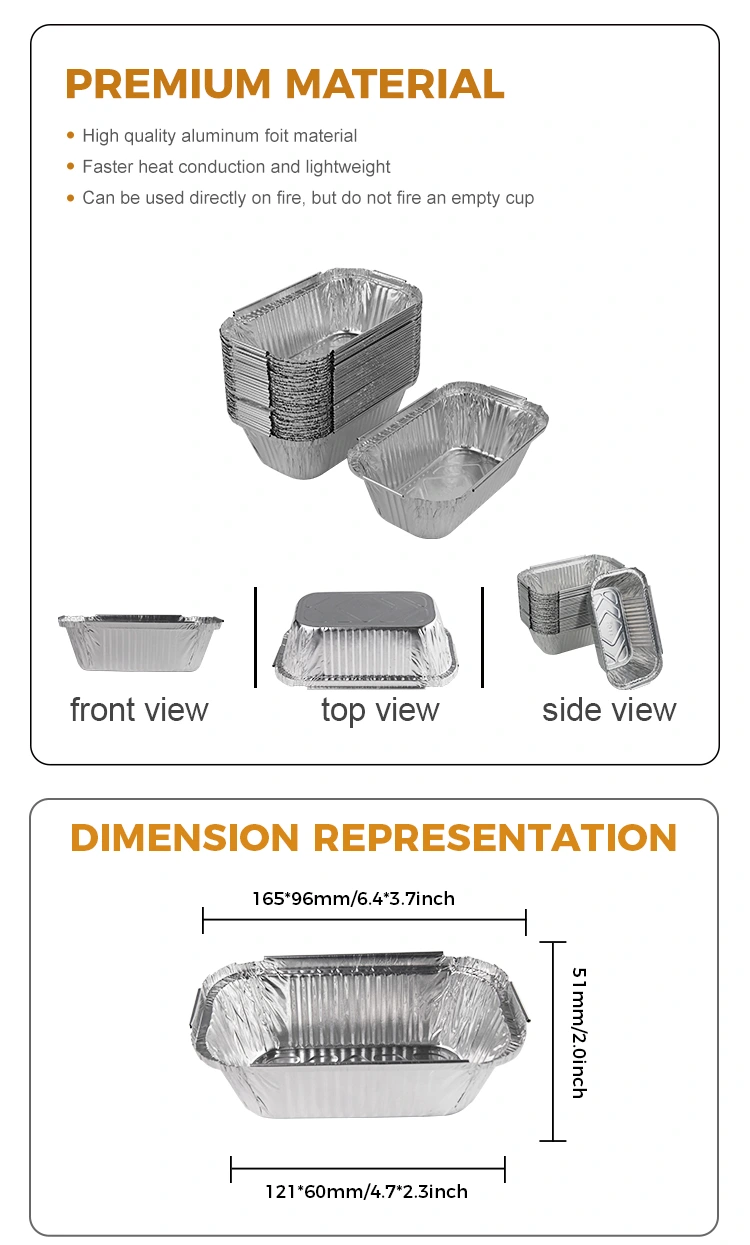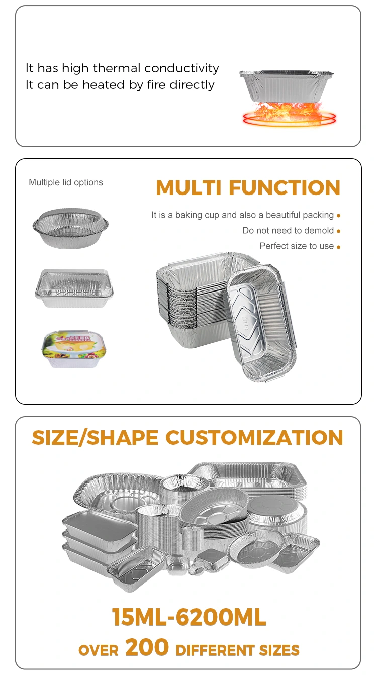 Vlastnosti: Obedový box z hliníkovej fólie, ktorú poskytujeme, je vyrobený z hliníkového materiálu hliníkovej fólie, ktorý má vynikajúci výkon tepelného konzervácie a môže účinne udržiavať teplotu potravín, čím sa vaše jedlo stane atraktívnejším. Obzvlášť naše obdĺžnikové kontajnery hliníkovej fólie na hliníkové fólie s pečenou ryžou majú nielen tepelné izolačné vlastnosti, ale môžu sa tiež kombinovať s viecami hliníkovej fólie alebo plastickými viečkami PET na uľahčenie prispôsobeného prispôsobenia logov, čím sa zlepšuje body pamäť zákazníkov a zlepšenie povedomia o značke.