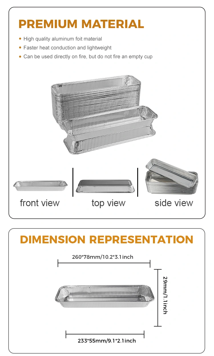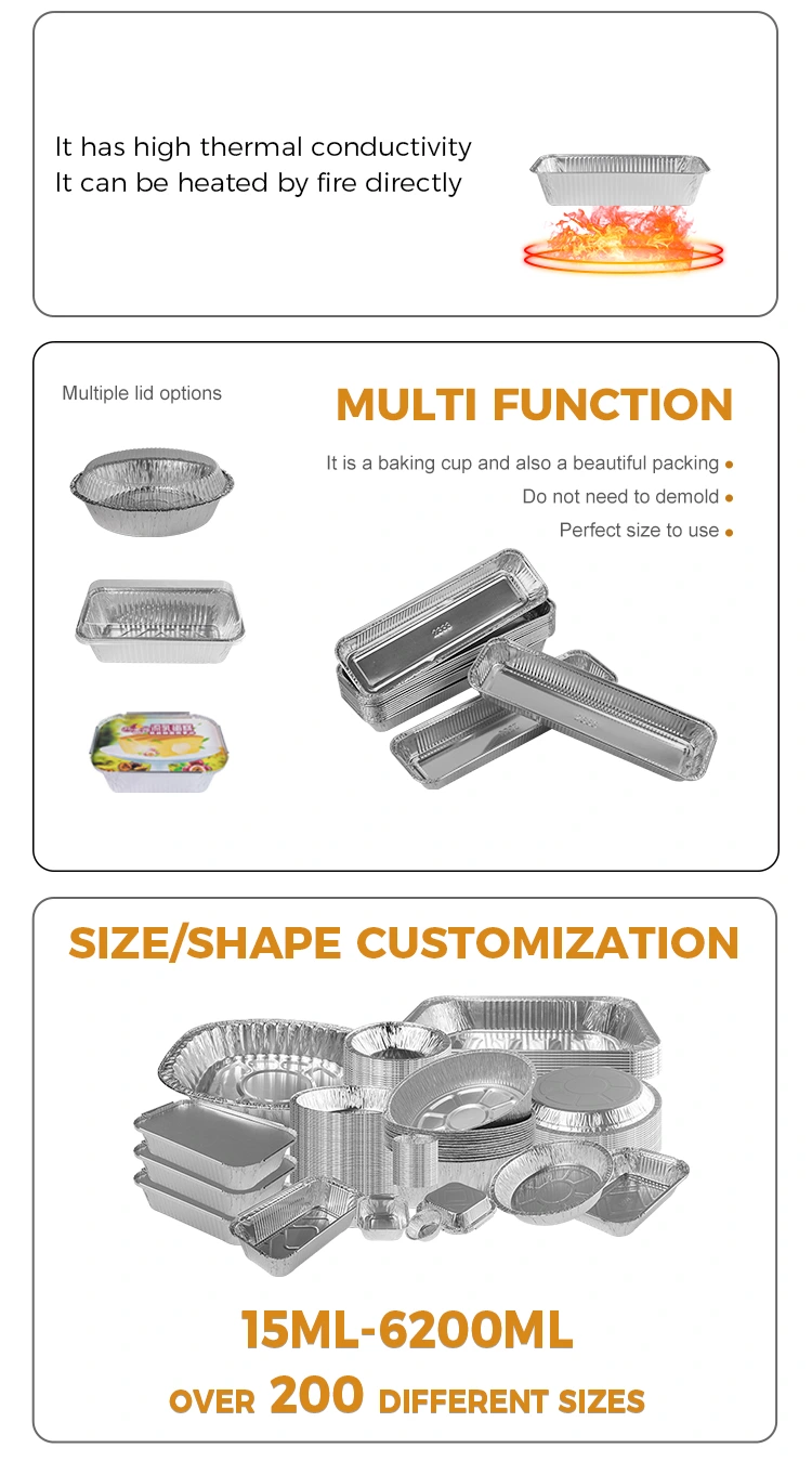 Vlastnosti: Veľkoobchod obedových krabíc je vyrobený z hliníkového materiálu hliníkovej fólie, ktorý má dobrý efekt na konzerváciu tepla a dokáže udržať teplotu potravín, vďaka čomu je jedlo chutnejšie a chutnejšie. Okrem toho má náš obdĺžnikový hliníkový fóliový nádoba na bbq tiež funkciu tepelnej izolácie a môže sa zladiť s vekom hliníkovej fólie a plastovým vekom PET.