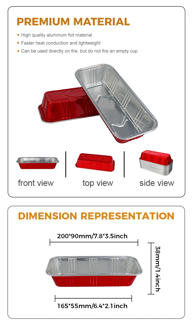 Pri domácom pečení používajte Obdĺžnikové červené pekárske cateringové strieborné hliníkové fóliové nádoby na výrobu dlhých pásikov chleba bez obáv, že sa cesto prilepí na plech alebo sa pripáli, a ľahko získate výrobok, ktorý bude vyzerať aj chutne; Pri príprave raňajok možno chlieb, ktorý bol naporciovaný minulú noc, ráno priamo zohriať v mikrovlnnej rúre a spárovať s mliekom pre rýchle a výživné jedlo. Na piknik alebo kempovanie noste so sebou chlieb alebo sendviče. Box z hliníkovej fólie dokáže udržať vonkajší prach. Keď chcete jesť, stačí otvoriť a vychutnať si. Nie je potrebné nosiť ďalší riad. Pri občerstvení v kancelárii sa môže chlebník vychladený v chladničke počas obedňajšej prestávky na pár minút ohriať a vy si môžete pochutnať na teplom a mäkkom chlebe. Nie je problém doplniť energiu.