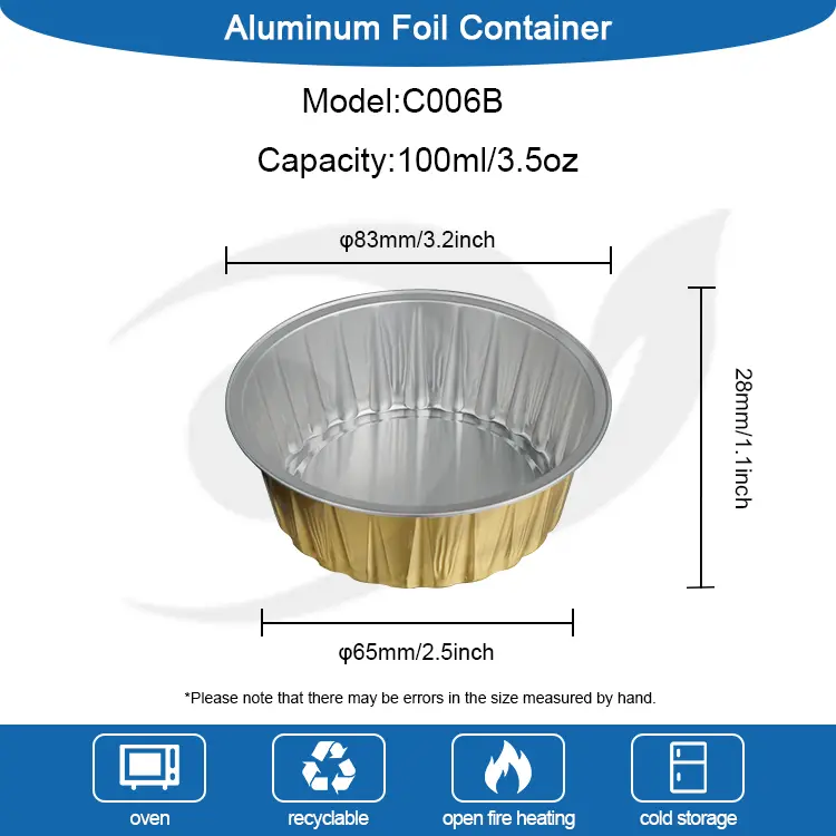 Hliníková hliníková fólia Dodávateľ okrúhle koláč na pečenie okuliare smoothwall hliníkové fólie C006B je hlavná malá a stredná pena, pečivo na mieru hliníkovú fóliu vyrobenú z hliníkovej fólie, kapacita je vždy tam, veľmi vhodná pre tvarohový koláč, koláč s penami, tiramisu, želé puding, cestoviny a iné používanie potravín. V porovnaní s hliníkovými šálkami hliníkových fólií, ktoré sa často vyskytujú, môže dizajn 100 ml poskytnúť veľmi bohatý priestor na zodpovednosť, ktorý je veľmi vhodný pre kaviarne, predávajú dezerty a je pre spotrebiteľov v pohode, aby mohli nakupovať a jesť okamžite.