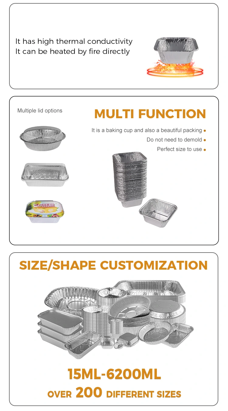 Hliníková fóliová fóliová fóliová nádoba na štvorcový vzduch používa vysokokvalitný materiál hliníkovej fólie, ktorý je ľahký a odolný. Horná časť je možné prispôsobiť priehľadným vekom pre domáce zvieratá a spodná časť má veko, ktoré je stlačené a upevnené v krabici, aby sa zabránilo prilepeniu potravín do plechu na pečenie, ktoré sa ľahko uvoľní a čistí a ľahko sa prepravuje a používa.