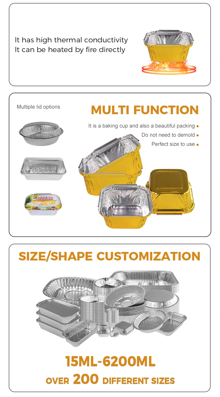 Yunchu Hliníková fólia štvorcová pekáreň Strieborná hliníková fóra Fólové kontajnery Protect bez premytia a viac ako vyprážanie, vodotesné a olejové odlievanie, bez potreby čistiaceho rúry, vzduchu, grilu, naparovanie špeciálneho, zhusteného materiálu opakovane používaného bez deformácie, ktoré je hustý Dusené vajcia, pečenie pudingu, ovocný šalát atď., Bezpečné vstupné materiály v oblasti kontaktu s potravinami, Yunchu prísne dodržiava požiadavky na výber veľkoobchodných materiálov na zdravie potravín, to znamená, že plesne sú tiež balenie, hliníková fóliová krycia kombinácia kombinácie veľkoobchodných objednávok prijíma aj objednávky, s jedinou vlastnou MOQ s 3000 kusmi.